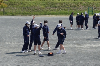 陸上大会、午後から団アピールが始まるまでの時間、生徒会企画による部活動対抗レクが行われました。部員と部活の道具を使って人文字をつくりました。言葉は各部で相談して決めます。撮影後、部長が人文字の写真と共に、文字に込めた思いをプレゼンしました。