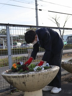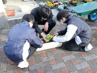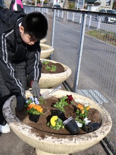 花の植え替え(緑化委員) 2026年1月13日 19時10分 緑化委員が花の植え替えをしました。 その後、定期的に緑化委員の子が水やりなどのお世話をしてくれています。 卒業式や入学式にはきれいな花を咲かせてくれるでしょう。